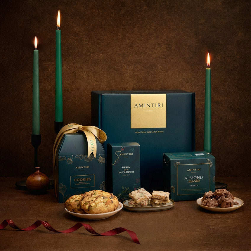 Your Hamper contains - Box of three assorted cookies: Crispy on the edges, chewy on the...