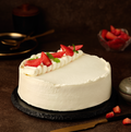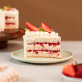 Moist and fluffy vanilla sponge layered with whipped cream, freshly chopped strawberries, and strawberry compote.