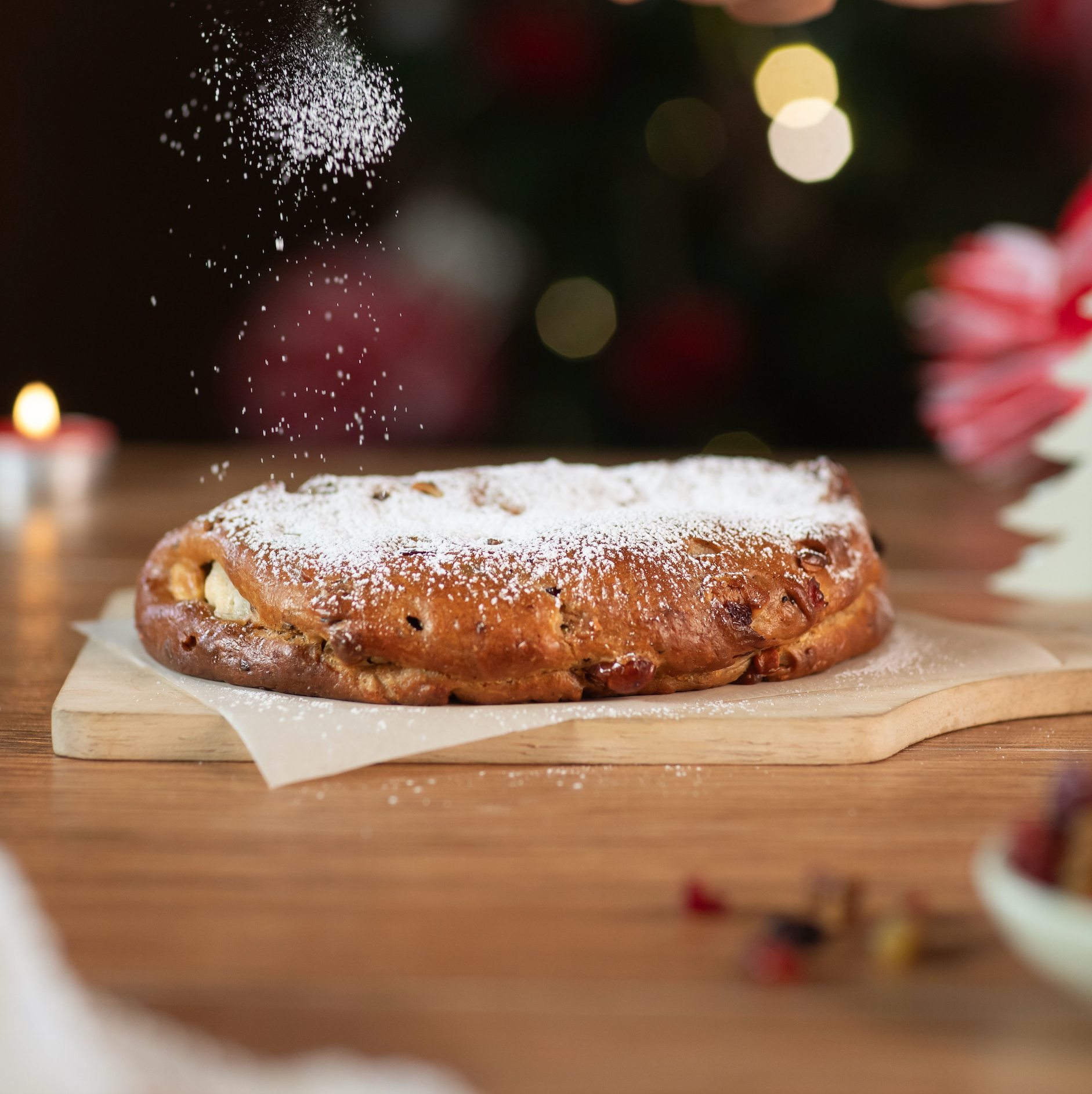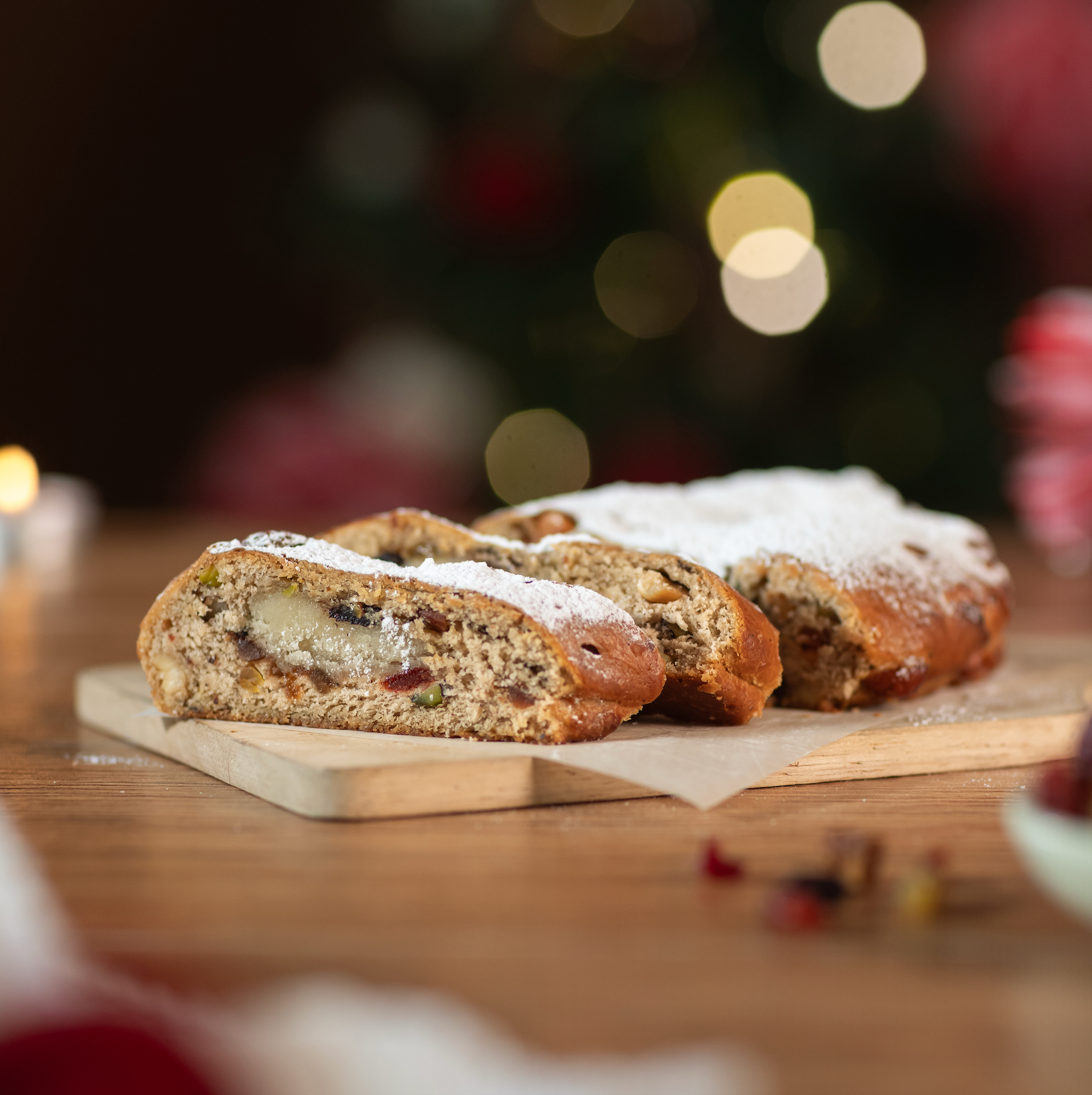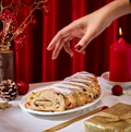 A cherished German Christmas bread, intricately blends nuts, spices, and dried fruit. Its exterior is adorned with powdered sugar, concealing a delectable core that features a layer of marzipan.