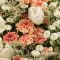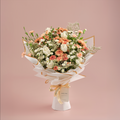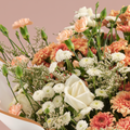 Your bouquet contains a mix of white roses, peach-yellow spray carnations, chrysanthemums, Calimero, and a touch of Limonium.