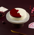 A refined French entremets composed of moist almond joconde, a crunchy almond praline croustillant, and a vibrant cherry fruit compote, all encased in a toasted almond mousse.