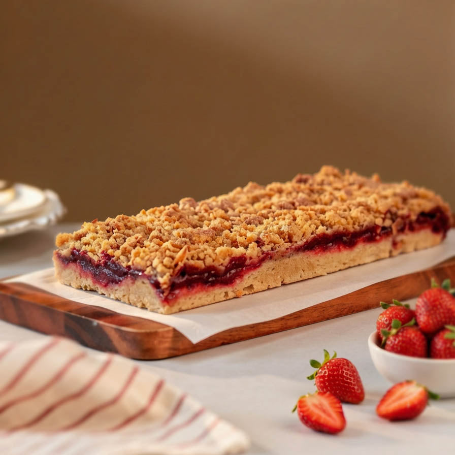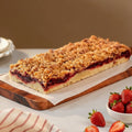A light vanilla and brown sugar cake layered with fresh Strawberry compote and finished with a crunchy streusel topping
